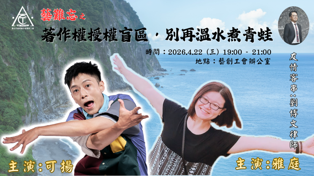 - 2026.04.22(三)雅庭可揚「藝」難忘:著作權授權盲區,別再溫水煮青蛙?feat.劉博文律師