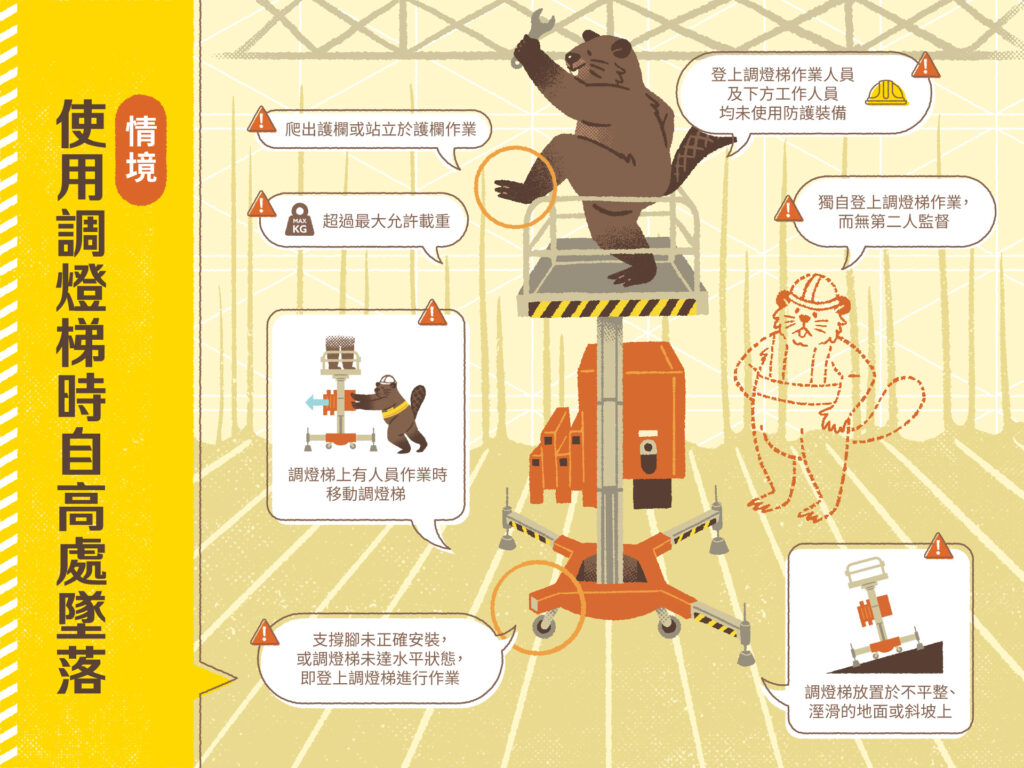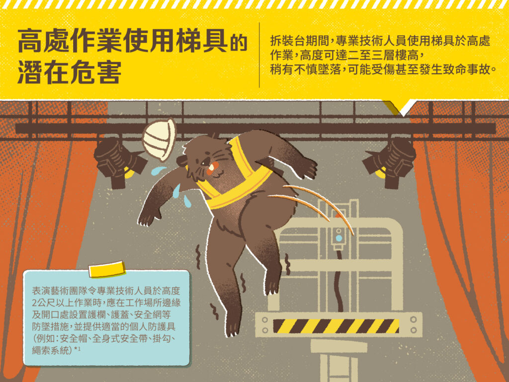 1. 根據《職業安全衛生法》第六條第1項第5款,對於有墜落、物體飛落或崩塌等之虞之作業場所引起之危害,雇主應有符合標準之必要安全衛生設備及措施。