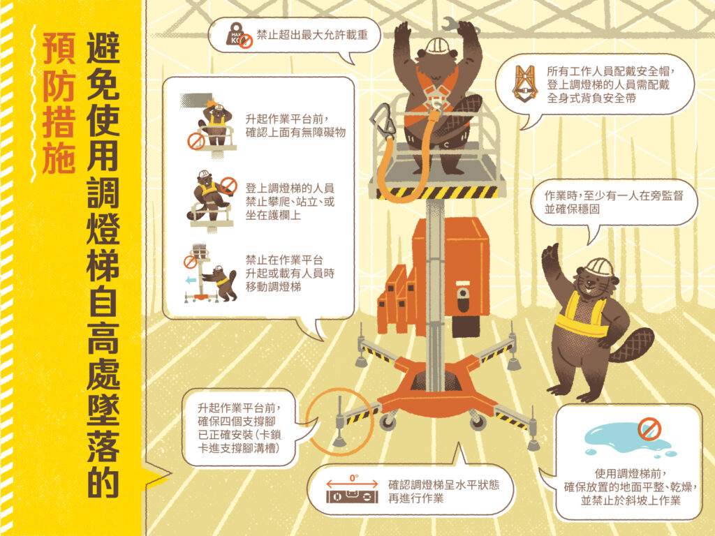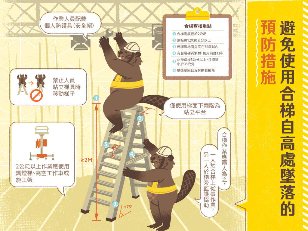 ● 參考《職業安全衛生設施規則》第230條的規定: (第1項)「雇主對於使用之合梯,應符合下列規定: 一、具有堅固之構造。 二、其材質不得有顯著之損傷、腐蝕等。 三、梯腳與地面之角度應在七十五度以內,且兩梯腳間有金屬等硬質繫材扣牢,腳部有防滑絕緣腳座套。 四、有安全之防滑梯面。」 (第2項)「雇主不得使勞工以合梯當作二工作面之上下設備使用,並應禁止勞工站立於頂板作業。」
