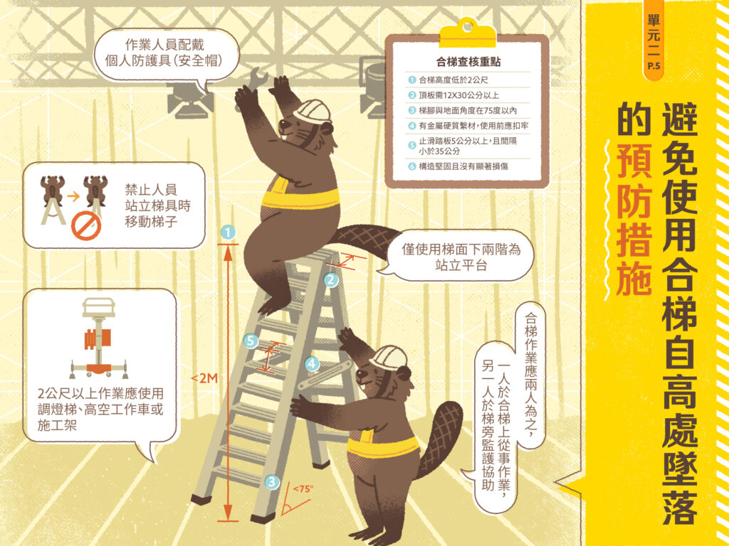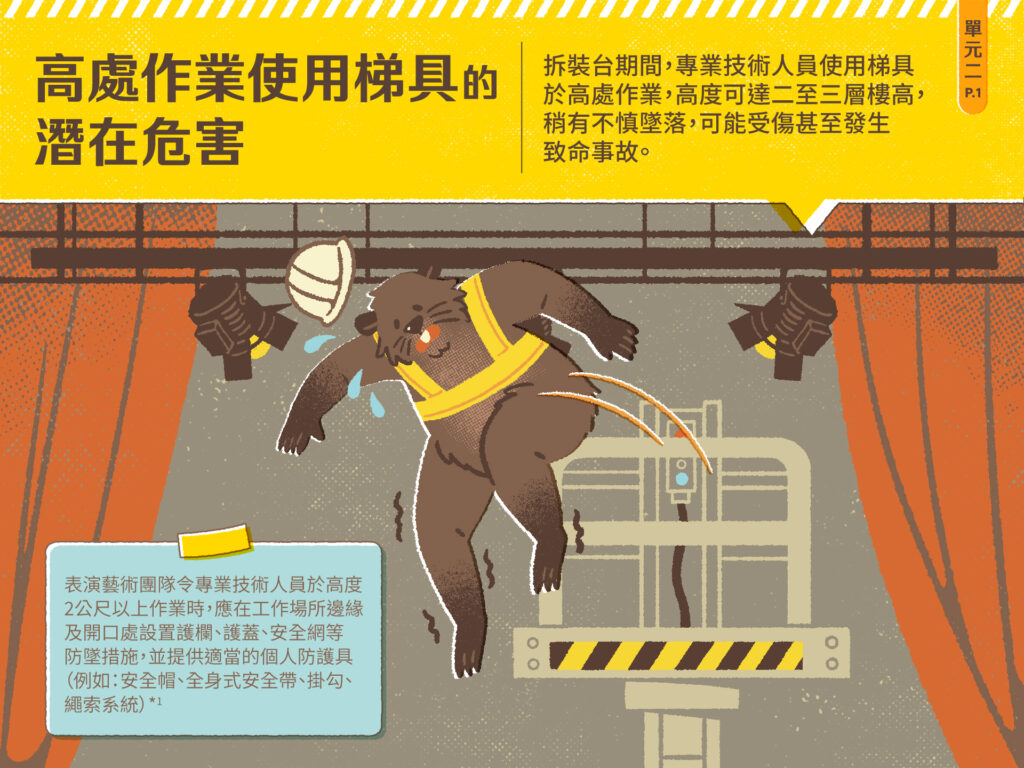 拆裝台期間,專業技術人員使用合梯或調燈梯於高處作業,高度可達二至三層樓高,稍有不慎墜落,可能受傷甚至發生致命事故。本單元將介紹高處作業使用梯具的潛在危害,包括兩個情境及相應的預防措施:
