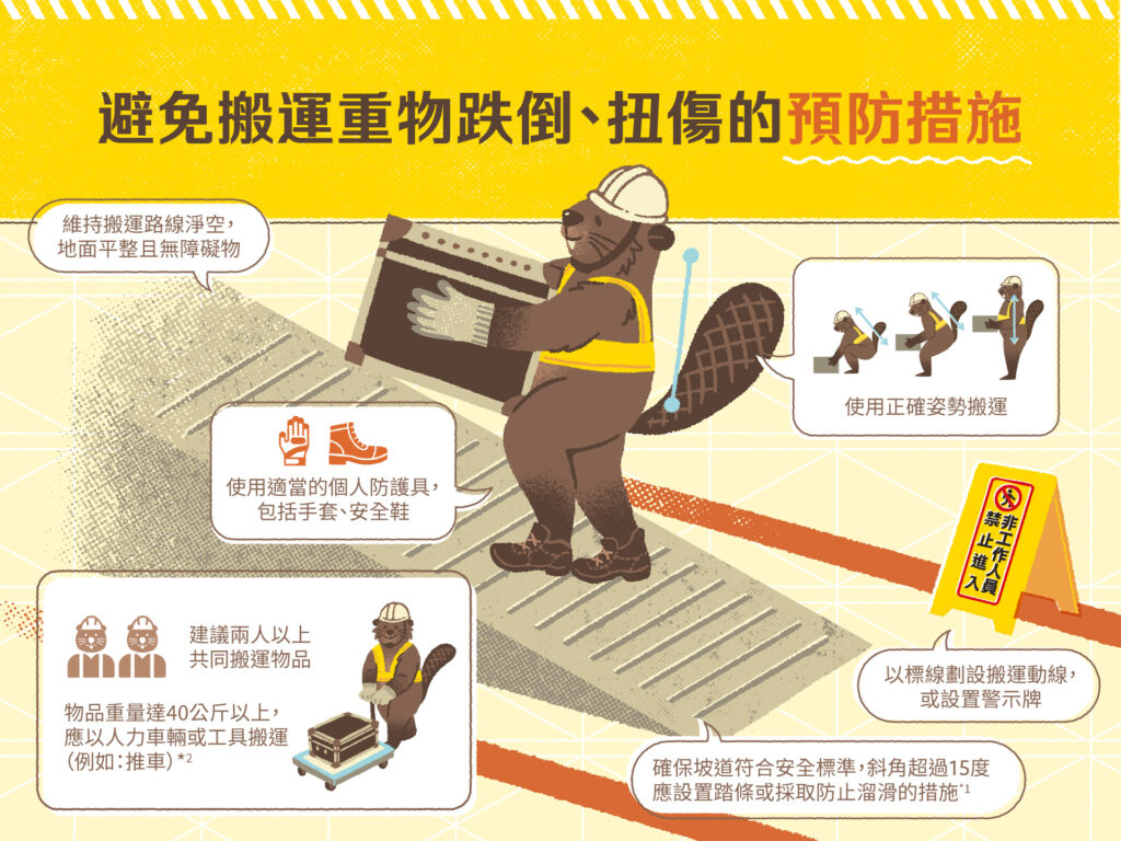 1. 根據《職業安全衛生設施規則》第36條第3款的規定:「雇主架設之通道及機械防護跨橋,傾斜超過十五度以上者,應設置踏條或採取防止溜滑之措施。」 2. 根據《職業安全衛生設施規則》第155條的規定:「雇主對於物料之搬運,應儘量利用機械以代替人力,凡40公斤以上物品,以人力車輛或工具搬運為原則,500公斤以上物品,以機動車輛或其他機械搬運為宜;運輸路線,應妥善規劃,並作標示。」